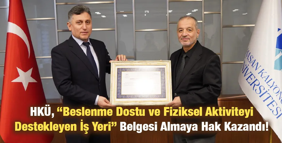 Sağlıkla ilgili konulara ilişkin plan, politika ve çalışmalar, beslenme ve fiziksel aktivite ile ilgili düzenlemeler ve sağlık hizmeti sunumu gibi konu başlıkları üzerinden Gaziantep İl Sağlık Müdürlüğü tarafından yapılan değerlendirme sonucunda; Hasan Kalyoncu Üniversitesi (HKÜ), “Beslenme Dostu ve Fiziksel Aktiviteyi Destekleyen İş Yeri” belgesi almaya hak kazandı.