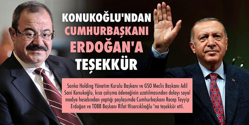 Sanko Holding Yönetim Kurulu Başkanı ve GSO Meclis Başkanı Adil Sani Konukoğlu, kısa çalışma ödeneğinin uzatılmasından dolayı soyal medya hesabından yaptığı paylaşımda Cumhurbaşkanı Recep Tayyip Erdoğan ve TOBB Başkanı Rifat Hisarcıklıoğlu ‘na teşekkür etti.