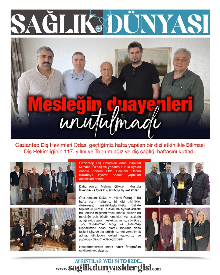 Sizleri de ziyaret ederek bu konuda bilgilendirmek istedik , sizlerin bu mesleğe çok büyük emekleri var ,sizlerin açtığı yolda genç meslektaşlarımızla birlikte , Türk dişhekimleri birliği ve Gaziantep Dişhekimleri odası olarak Topluma daha kaliteli ağız ve diş sağlığı hizmeti verebilmek adına, elimizden geleni yapıyoruz ve yapmaya devam edeceğiz dedi ,Hoşsohbetlerden sonra hatıra fotografları çekilerek vedalaşıldı.