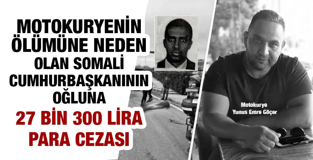 Motokurye Yunus Emre Göçer’in ölümüne neden olan Somali Cumhurbaşkanı’nın oğlu Muhammed Hasan Şeyh Mahmud hakkında, “taksirle ölüme neden olmak” suçundan 2 yıl 6 ay hapis cezası verildi. Hapis cezası adli para cezasına çevrilen Mahmud, 27 bin 300 lira para cezası ödeyecek.