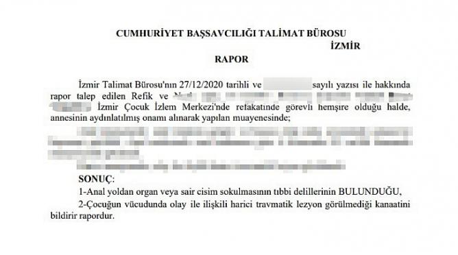 Bu sırada babanın velayeti yok ama kişisel ilişki kurulabilmesi için ara kararla bir durum tahsis ediliyor. Bundan kaynaklı olarak hafta sonu çocuğun babayla görüşmesi sonrası çocuğun anal bölgesinde kızarıklar tespit ediliyor. Anne olayın hemen ardından tekrar savcılığa gidiyor. Savcılık, Çocuk İzleme Merkezi’nden bir rapor aldırılmasını muayene yapılmasını istiyor.