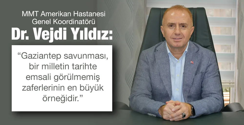 Gaziantep’in düşman işgalinden kurtuluşunun 102.yılı nedeniyle bir mesaj yayımlayan Gaziantep Özel MMT Amerikan Hastanesi Genel Koordinatörü Dr. Vejdi Yıldız, “Gaziantep savunması, bir milletin tarihte emsali görülmemiş zaferlerinin en büyük örneğidir. 25 Aralık tarihi sadece Gaziantep için değil Türkiye için de büyük bir anlam taşımaktadır” dedi.