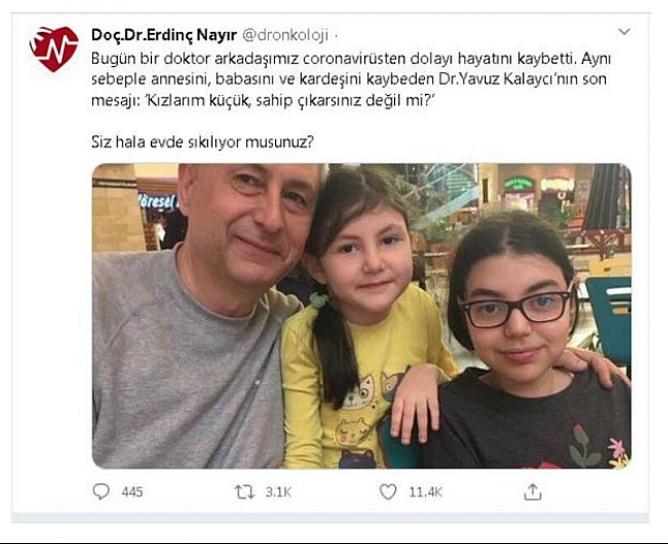 Yeni tip corona virüs nedeniyle hayatını kaybeden doktor Yavuz Kalaycı’nın meslektaşı Doç. Dr. Erdinç Nayır’ın, sosyal paylaşım sitesinden yaptığı paylaşım yürekleri yaktı. Nayır yaptığı paylaşımda, “Bugün bir doktor arkadaşımız coronavirüsten dolayı hayatını kaybetti. Aynı sebeple annesini, babasını ve kardeşini kaybeden Dr. Yavuz Kalaycı’nın son mesajı: ‘Kızlarım küçük, sahip çıkarsınız değilm mi’ Siz hala evde sıkılıyor musunuz?” dedi.