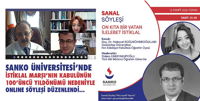 SANKO Üniversitesi’nde İstiklal Marşı’nın kabulünün 100’üncü yıl dönümü nedeniyle Ortak Dersler Birimi, Türk Dili Birimi Öğretim Görevlisi Didem Karayakupoğlu’nun danışmanlığını yaptığı Edebiyat Kulübü tarafından “On Kıta Bir Vatan, İlelebet İstiklal” konulu online söyleşi düzenlendi.