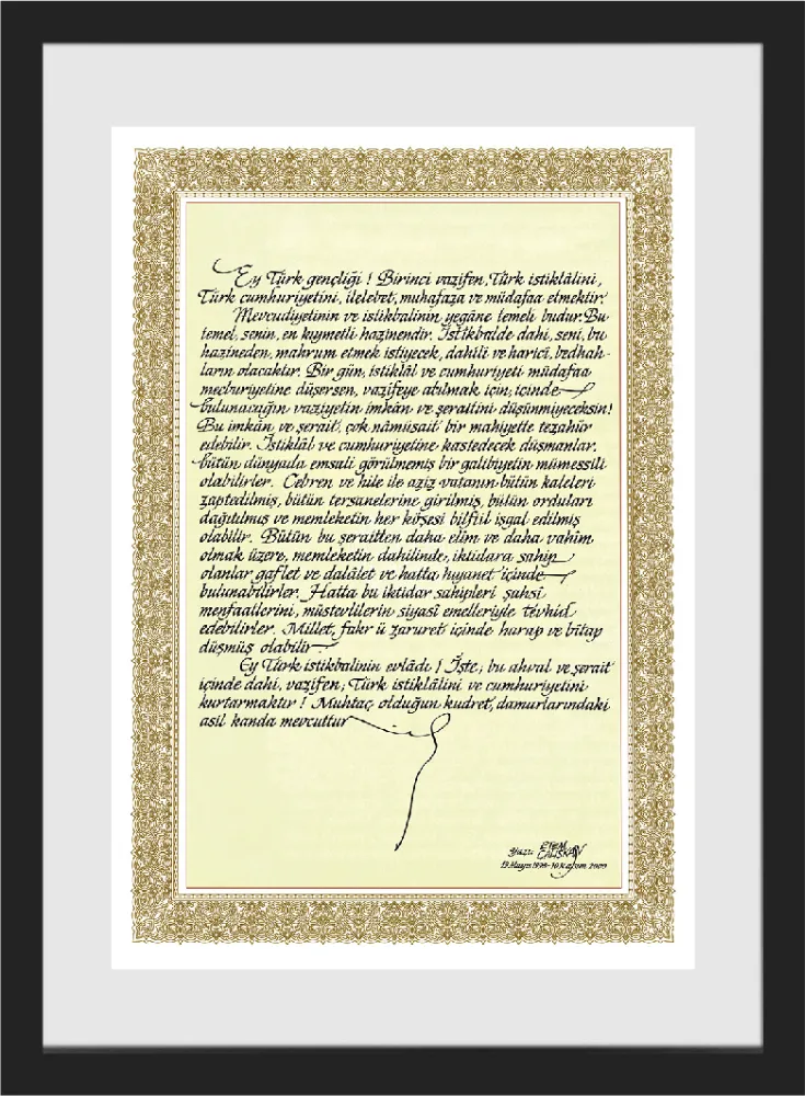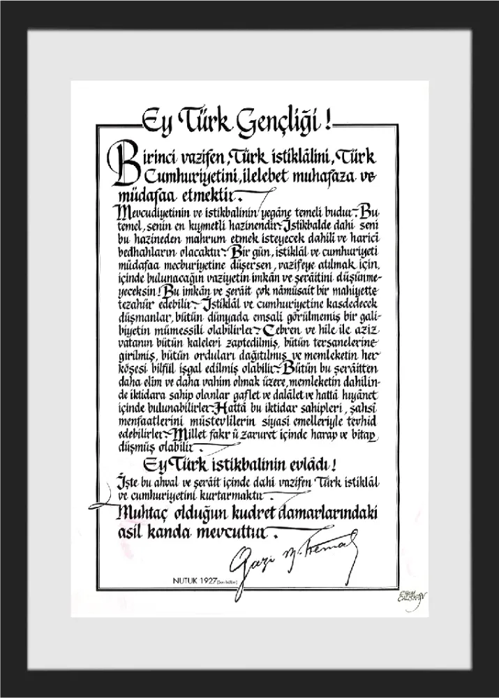 Yeni yazı ile hat yapan Etem Çalışkan, Türkiye'de ders kitaplarında yer alan Atatürk'ün Gençliğe Hitabesi ve İstiklal Marşı'nın yazımını yapan kişidir; fonda yer alan meşhur Atatürk portresinin de çizeridir.