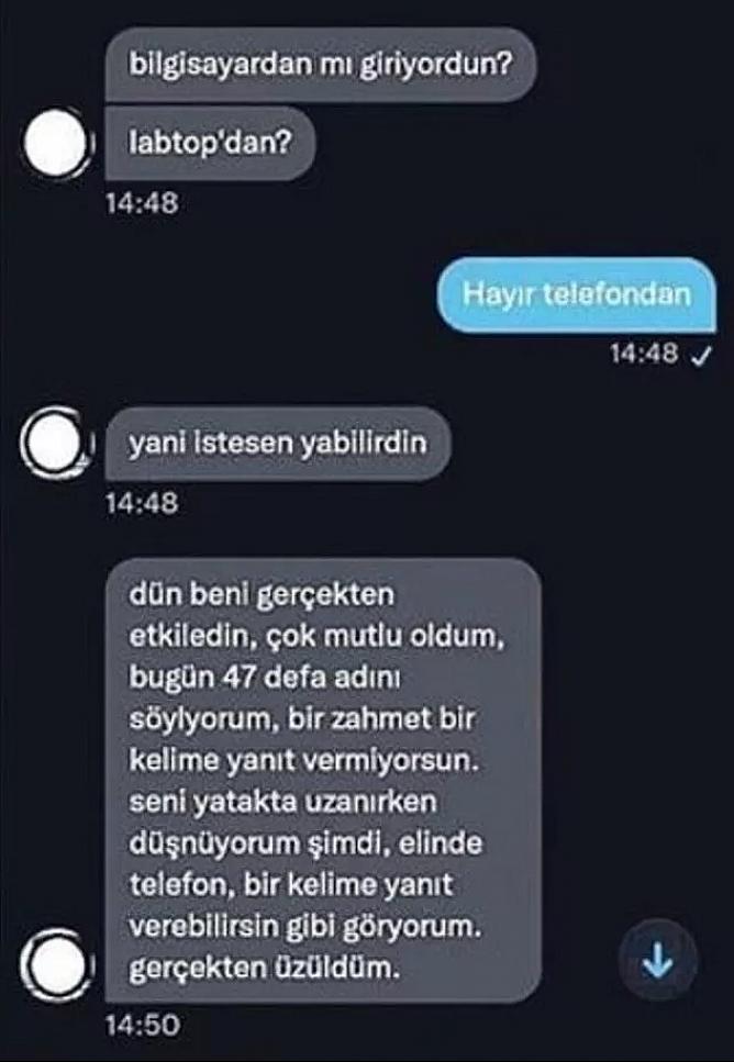 Dün beni gerçekten etkiledin, çok mutlu oldum. Bugün 47 defa adını söylüyorum, bir zahmet bir kelime yanıt vermiyorsun. Seni yatakta uzanırken düşünüyorum şimdi, elinde telefon, bir kelime yanıt verebilirsin gibi görüyorum. Gerçekten üzüldüm.