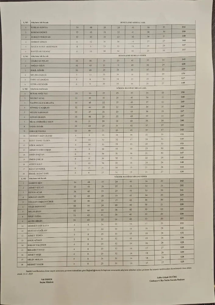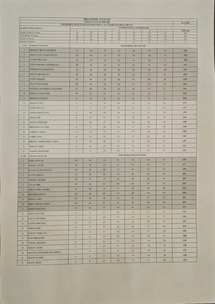 Türk Eczacıları Birliği 45. Olağan Büyük Kongresi 20-21-22 Kasım 2025 tarihlerinde Ankara’da toplanmış, 23 Kasım 2025 Pazar günü 09.00-17.00 saatleri arasında Türk Eczacıları Birliği Kurullarının seçimi gerçekleşmiştir. Türk Eczacıları Birliği 45. Olağan Büyük Kongresi’nin 23 Kasım 2025 tarihinde yapılan Merkez Heyeti, Denetleme Kurulu ve Yüksek Haysiyet Divanı seçimleri için kesin olmayan sonuçları gösterir seçim tutanakları aşağıda yer almaktadır. Tüm meslektaşlarımızın bilgisine sunarız.
