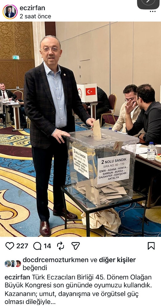 Türk eczacılar birliği seçimlerini Gaziantep Eczacılarından , önceki dönem Eczacı odası başkanı İrfan Demirci kazandı Meslek için elele listesi kazandı İrfan Demirci 260 - 153 oy farkıyla kazandı