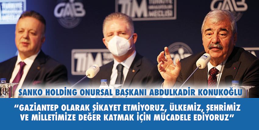 SANKO Holding Onursal Başkanı Abdulkadir Konukoğlu, Gaziantep’in her koşulda ihracat ve istihdamını artıran bir şehir olduğunu belirterek, “Gaziantep olarak şikayet etmiyoruz, ülkemiz, şehrimiz ve milletimize değer katmak için mücadele ediyoruz” dedi.