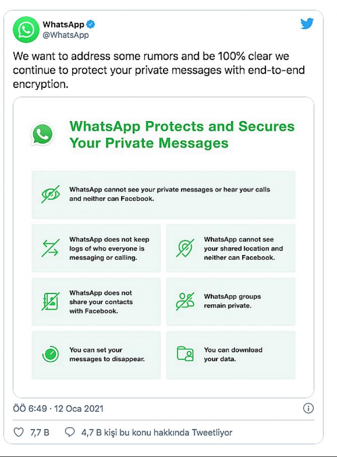 WhatsApp yaptığı açıklamada, bazı söylentilere değinmek ve yüzde 100 net olmak istediklerini belirterek, ‘’Özel mesajlarınızı uçtan uca şifreleme ile korumaya devam ediyoruz. Gizlilik politikasındaki güncelleme, arkadaşlarınız veya ailenizle olan mesajlarınızın gizliliğini etkilemez’’ ifadelerinde bulundu.(mynet)