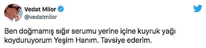Salkım’a tepki gösteren isimlerden biri de Gastronomi Yazarı Vedat Milor oldu. Milor, Salkım’ın paylaşımına “Ben doğmamış sığır serumu yerine içine kuyruk yağı koyduruyorum Yeşim Hanım. Tavsiye ederim” ifadeleriyle yanıt verdi.(tele1.com.tr)